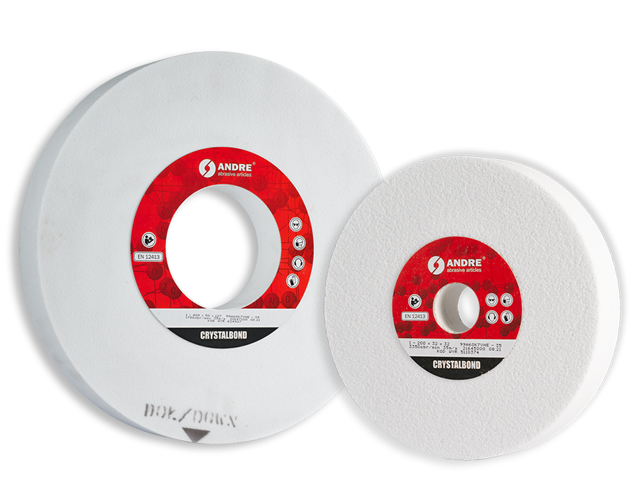 ANDRE TYPE 1 CRYSTALBOND grinding wheels belonging to the family of abrasive tools with innovative glass-crystal bond are manufactured, among others, on the basis of white aluminium oxide (99A). For special applications, ANDRE also offers other combinations of abrasive grains with excellent performance characteristics.